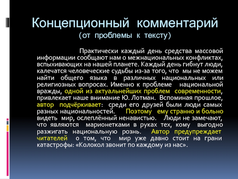 нам о межнациональных конфликтах, вспыхивающих на нашей планете. Каждый день гибнут люди, калечатся человеческие судьбы из-за того, что мы не можем найти общего языка в различных национальных или религиозных вопросах. Именно к проблеме национальной вражды, одной из актуальнейших проблем современности, привлекает наше внимание Ю. Лотман. Вспоминая прошлое, автор подчёркивает: среди его друзей были люди самых разных национальностей. Поэтому ему странно и больно видеть мир, ослеплённый ненавистью. Люди не замечают, что являются марионетками в руках тех, кому выгодно разжигать национальную рознь. Автор предупреждает читателей о том, что мир уже давно стоит на грани катастрофы: «Колокол звонит по каждому из нас».