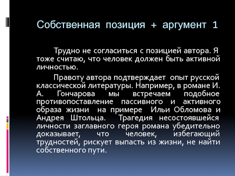 Правоту автора подтверждает опыт русской классической литературы. Например, в романе И.А. Гончарова мы встречаем подобное противопоставление пассивного и активного образа жизни на примере Ильи Обломова и Андрея Штольца. Трагедия несостоявшейся личности заглавного героя романа убедительно доказывает, что человек, избегающий трудностей, рискует выпасть из жизни, не найти собственного пути.