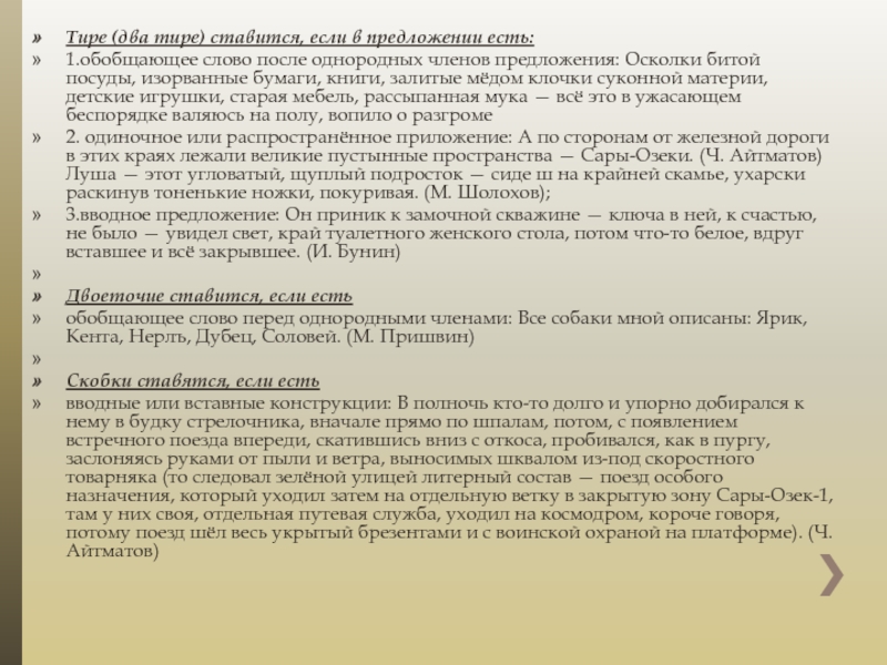 вводные или вставные конструкции: В полночь кто-то долго и упорно добирался к нему в будку стрелочника, вначале прямо по шпалам, потом, с появлением встречного поезда впереди, скатившись вниз с откоса, пробивался, как в пургу, заслоняясь руками от пыли и ветра, выносимых шквалом из-под скоростного товарняка (то следовал зелёной улицей литерный состав — поезд особого назначения, который уходил затем на отдельную ветку в закрытую зону Сары-Озек-1, там у них своя, отдельная путевая служба, уходил на космодром, короче говоря, потому поезд шёл весь укрытый брезентами и с воинской охраной на платформе). (Ч. Айтматов)