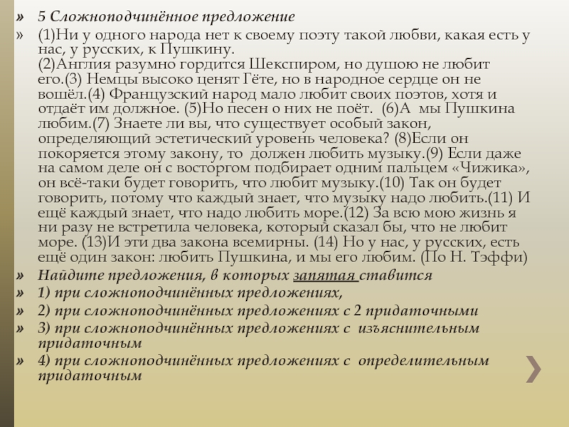 разумно гордится Шекспиром, но душою не любит его.(3) Немцы высоко ценят Гёте, но в народное сердце он не вошёл.(4) Французский народ мало любит своих поэтов, хотя и отдаёт им должное. (5)Но песен о них не поёт. (6)А мы Пушкина любим.(7) Знаете ли вы, что существует особый закон, определяющий эстетический уровень человека? (8)Если он покоряется этому закону, то должен любить музыку.(9) Если даже на самом деле он с восторгом подбирает одним пальцем «Чижика», он всё-таки будет говорить, что любит музыку.(10) Так он будет говорить, потому что каждый знает, что музыку надо любить.(11) И ещё каждый знает, что надо любить море.(12) За всю мою жизнь я ни разу не встретила человека, который сказал бы, что не любит море. (13)И эти два закона всемирны. (14) Но у нас, у русских, есть ещё один закон: любить Пушкина, и мы его любим. (По Н. Тэффи)
