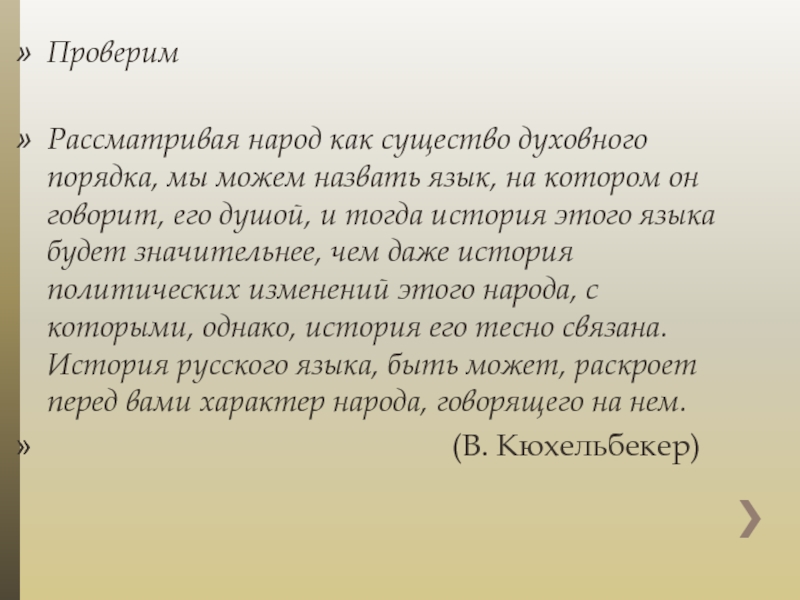 язык на котором он говорит его душой и тогда история этого языка будет значительнее чем даже история политических изменений этого народа с которыми однако история его тесно связана. История русского языка быть может раскроет перед вами характер народа говорящего на нем.