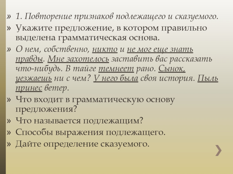 Слайд 61. Повторение признаков подлежащего и сказуемого.