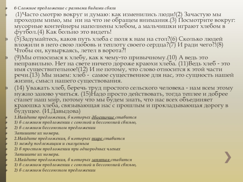 (14) Уважать хлеб, беречь труд простого сельского человека - нам всем этому нужно заново учиться. (15)Надо просто действовать, тогда теплее и добрее станет наш мир, потому что мы будем знать, что нас всех объединяет краюшка хлеба, связывающая нас с прошлым и прокладывающая дорогу в будущее. (И.Давыдова)
