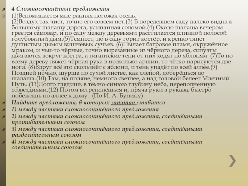 шалашу дорога, усыпанная соломой.(4) Около шалаша вечером греется самовар, и по саду между деревьями расстилается длинной полосой голубоватый дым.(5)Темнеет, но в саду горит костёр, и крепко тянет душистым дымом вишнёвых сучьев. (6)Пылает багровое пламя, окружённое мраком, и чьи-то чёрные, точно вырезанные из чёрного дерева, силуэты двигаются вокруг костра, а гигантские тени от них ходят по яблоням. (7)То по всему дереву ляжет чёрная рука в несколько аршин, то чётко нарисуются две ноги. (8)Вдруг всё это скользнёт с яблони, и тень упадёт по всей аллее.(9)Поздней ночью, шурша по сухой листве, как слепой, доберёшься до шалаша.(10) Там, на поляне, немного светлее, а над головой белеет Млечный Путь. (11)Долго глядишь в тёмно-синюю глубину неба, переполненную созвездиями.(12) Потом встрепенёшься и, пряча руки в рукава, быстро побежишь по аллее к дому. (По И. А. Бунину)