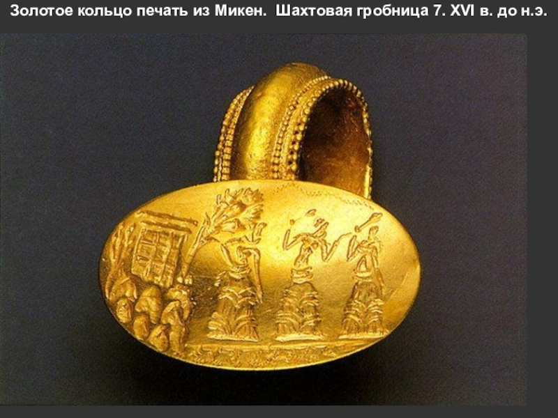 Слайд 20Золотое кольцо печать из Микен. Шахтовая гробница 7. XVI в.