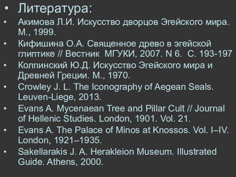 Литература:Акимова Л.И. Искусство дворцов Эгейского мира. М., 1999.Кифишина О.А. Священное древо в эгейской глиптике // Вестник МГУКИ,