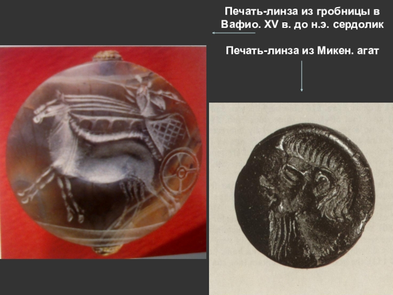 Печать-линза из гробницы в Вафио. XV в. до н.э. сердолик  Печать-линза из Микен. агат