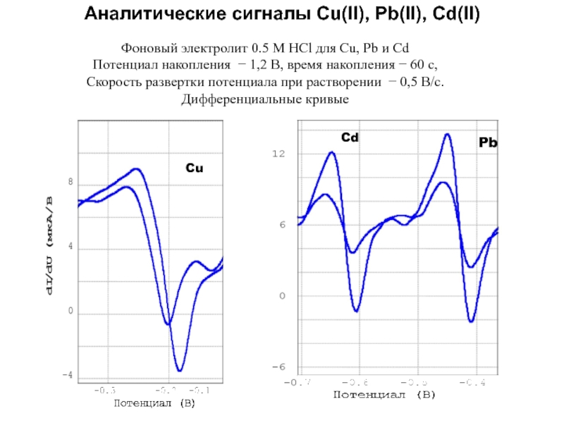 Слайд 48Аналитические сигналы Cu(II), Pb(II), Cd(II)