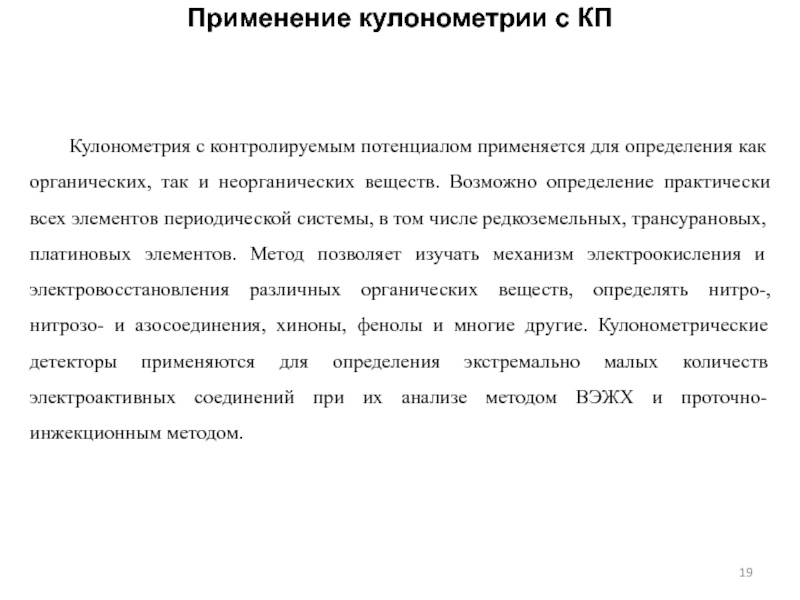 Слайд 19Применение кулонометрии с КП