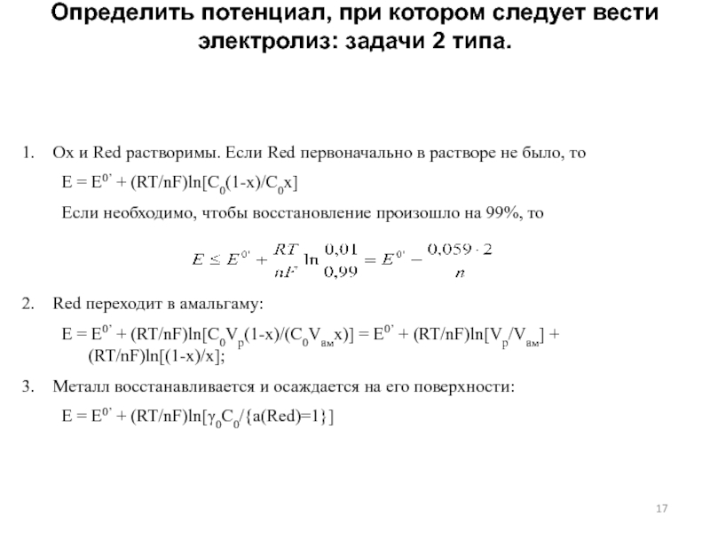 Слайд 17Определить потенциал, при котором следует вести электролиз: задачи 2 типа.