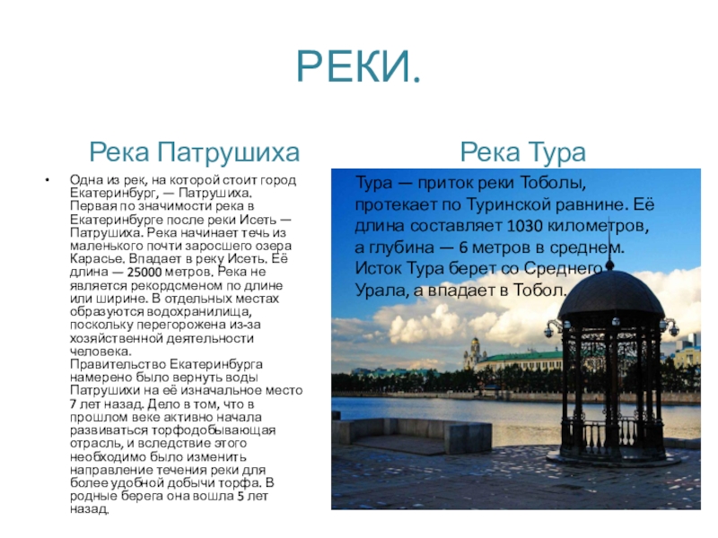 Тура — приток реки Тоболы, протекает по Туринской равнине. Её длина составляет 1030 километров, а глубина — 6 метров в среднем. Исток Тура берет со Среднего Урала, а впадает в Тобол.