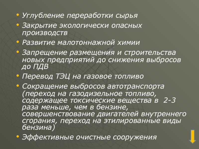 Сокращение выбросов автотранспорта (переход на газодизельное топливо, содержащее токсические вещества в 2-3 раза меньше, чем в бензине, совершенствование двигателей внутреннего сгорания, переход на этилированные виды бензина)