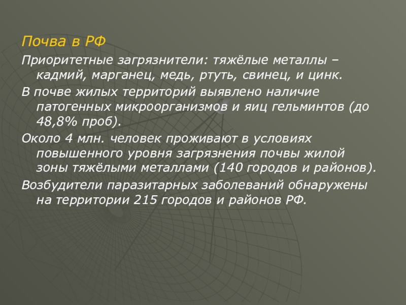 Около 4 млн. человек проживают в условиях повышенного уровня загрязнения почвы жилой зоны тяжёлыми металлами (140 городов и районов).