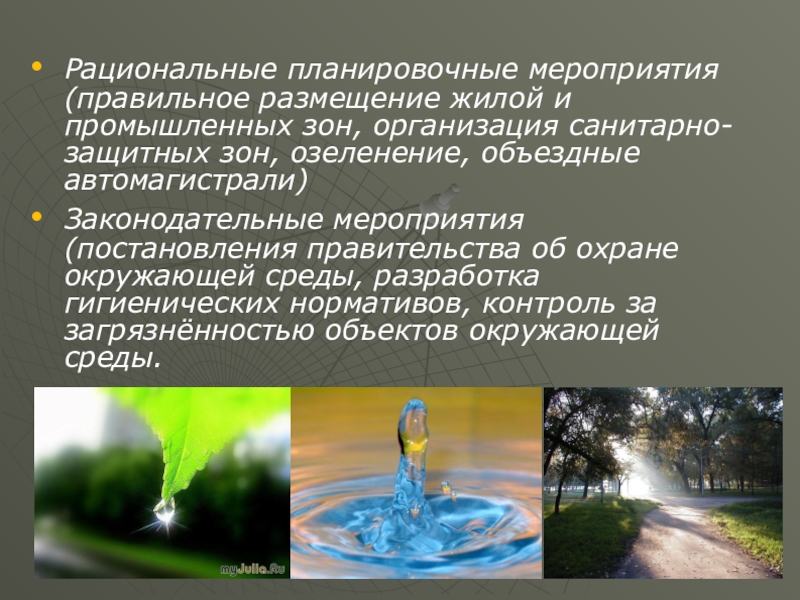 Слайд 21Рациональные планировочные мероприятия (правильное размещение жилой и промышленных зон, организация