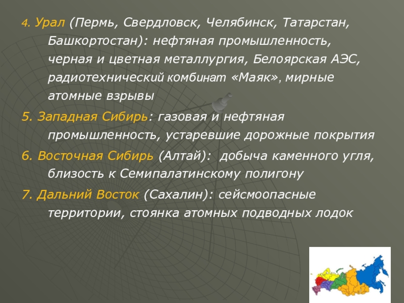 6. Восточная Сибирь (Алтай): добыча каменного угля, близость к Семипалатинскому полигону