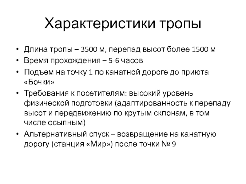 Характеристики тропыДлина тропы – 3500 м, перепад высот более 1500 мВремя прохождения – 5-6 часовПодъем на точку