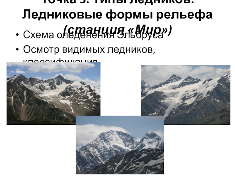 Слайд 6Точка 3. Типы ледников. Ледниковые формы рельефа (станция «Мир»)