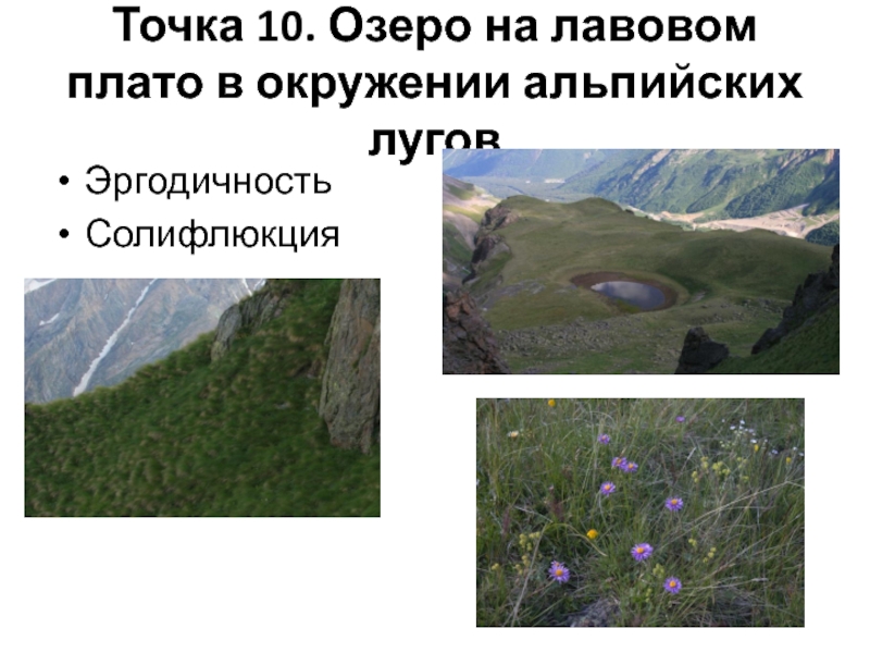 Слайд 14Точка 10. Озеро на лавовом плато в окружении альпийских лугов
