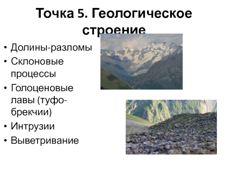 Точка 5. Геологическое строениеДолины-разломыСклоновые процессыГолоценовые лавы (туфо-брекчии)ИнтрузииВыветривание