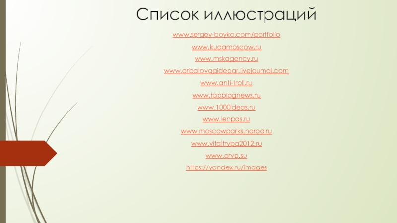 Список иллюстраций www.sergey-boyko.com/portfoliowww.kudamoscow.ruwww.mskagency.ruwww.arbatovagidepar.livejournal.comwww.anti-troll.ruwww.topblognews.ruwww.1000ideas.ruwww.lenpas.ruwww.moscowparks.narod.ru www.vitaitryba2012.ruwww.orvp.suhttps://yandex.ru/images