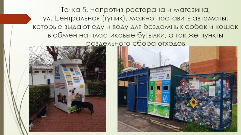 и кошек в обмен на пластиковые бутылки, а так же пункты раздельного сбора отходов