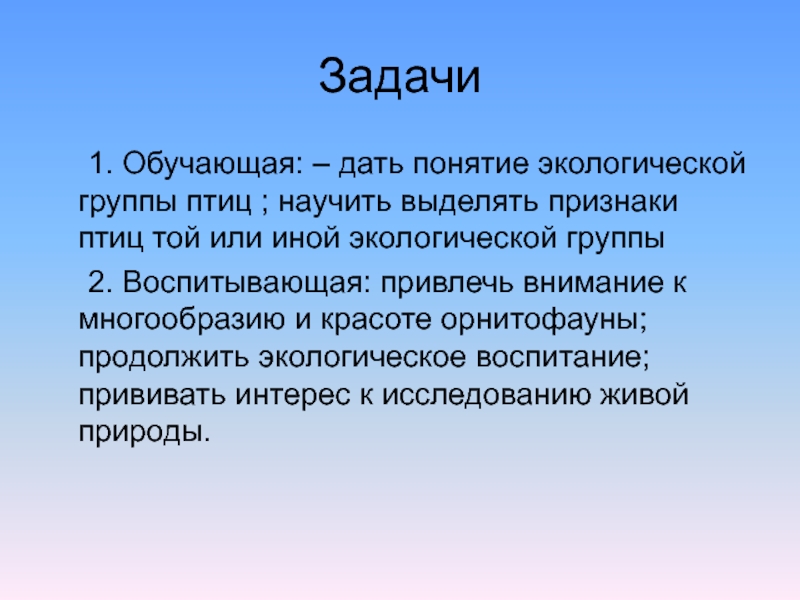 Задачи	1. Обучающая: – дать понятие экологической группы птиц ; научить выделять признаки птиц той или иной экологической