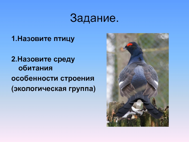 Задание.1.Назовите птицу2.Назовите среду обитанияособенности строения(экологическая группа)