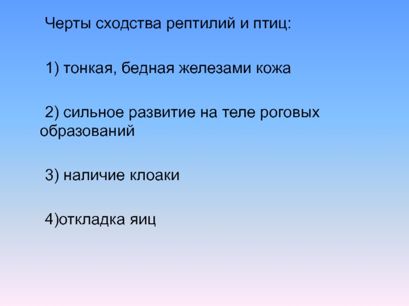 Черты сходства рептилий и птиц:	1) тонкая, бедная железами кожа	2) сильное развитие на теле роговых образований	3) наличие клоаки