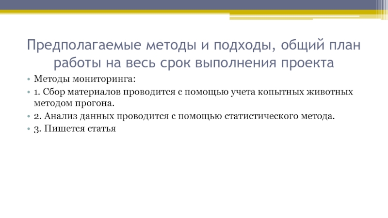 Слайд 12Предполагаемые методы и подходы, общий план работы на весь срок