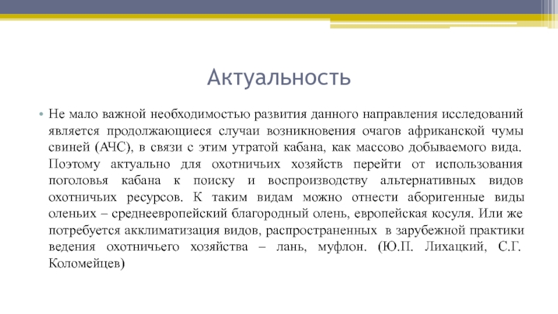 этим утратой кабана, как массово добываемого вида. Поэтому актуально для охотничьих хозяйств перейти от использования поголовья кабана к поиску и воспроизводству альтернативных видов охотничьих ресурсов. К таким видам можно отнести аборигенные виды оленьих – среднеевропейский благородный олень, европейская косуля. Или же потребуется акклиматизация видов, распространенных в зарубежной практики ведения охотничьего хозяйства – лань, муфлон. (Ю.П. Лихацкий, С.Г. Коломейцев)