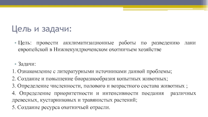 Цель: провести акклиматизационные работы по разведению лани европейской