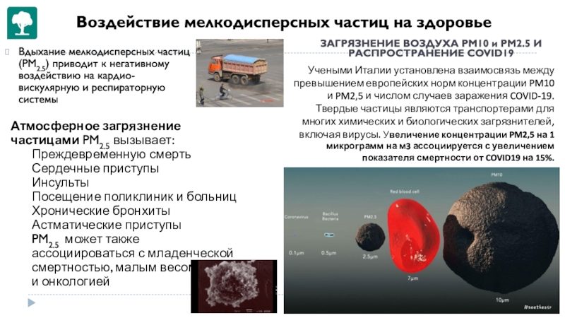 Учеными Италии установлена взаимосвязь между превышением европейских норм концентрации PM10 и PM2,5 и числом случаев заражения COVID-19. Твердые частицы являются транспортерами для многих химических и биологических загрязнителей, включая вирусы. Увеличение концентрации PM2,5 на 1 микрограмм на м3 ассоциируется с увеличением показателя смертности от COVID19 на 15%.