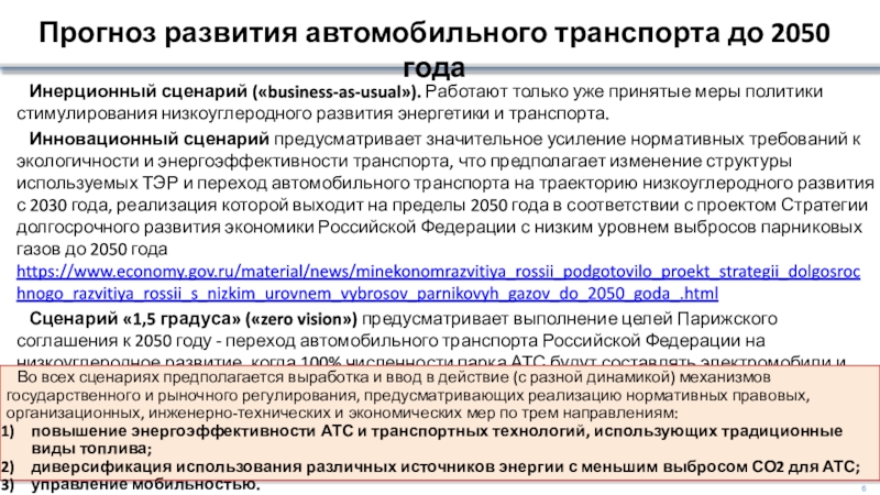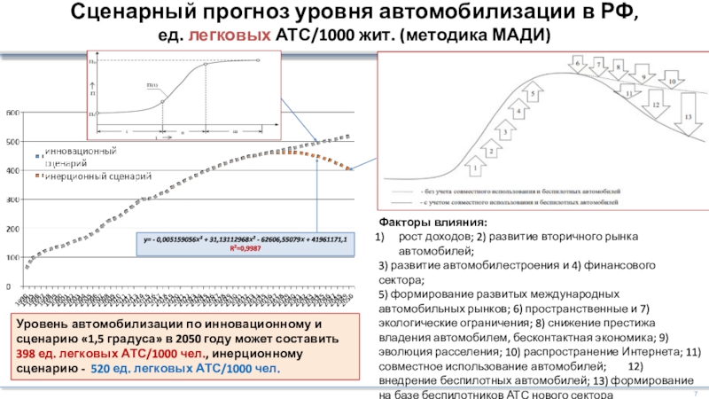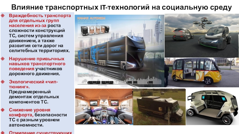5) формирование развитых международных автомобильных рынков; 6) пространственные и 7) экологические ограничения; 8) снижение престижа владения автомобилем, бесконтактная экономика; 9) эволюция расселения; 10) распространение Интернета; 11) совместное использование автомобилей; 12) внедрение беспилотных автомобилей; 13) формирование на базе беспилотников АТС нового сектора индивидуализированного общественного транспорта. (Ксенофонтов М.Ю., Милякин С.Р. , 2018)