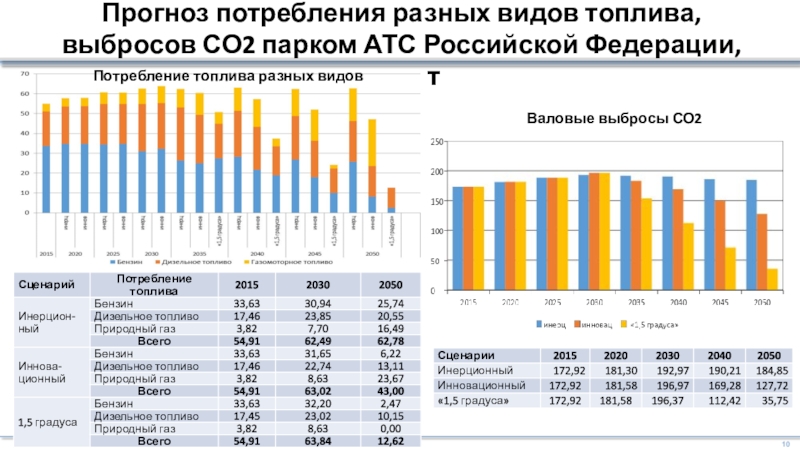 До 2034 года численность парка АТС будет расти по всем сценариям одинаково - до 73,75 млн. ед. При реализации инерционного сценария численность парка АТС в 2050 году составит 80,66 млн. ед.; инновационного и сценария «1,5 градуса» – достигнет максимума в 2037 году (74,03 млн. ед.), затем сократится до 61,34 млн. ед. в 2050 году.