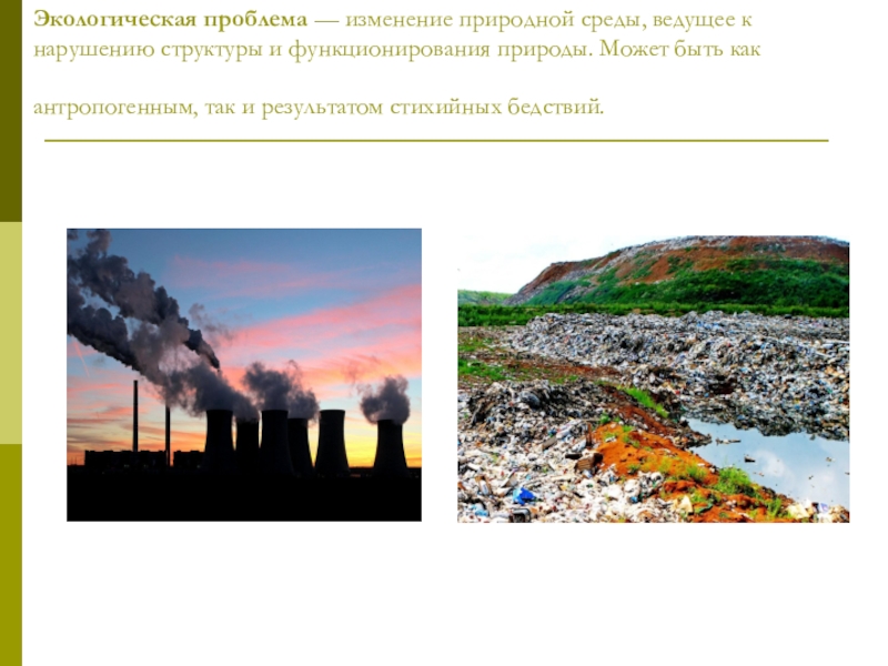 Слайд 2Экологическая проблема — изменение природной среды, ведущее к нарушению структуры и функционирования