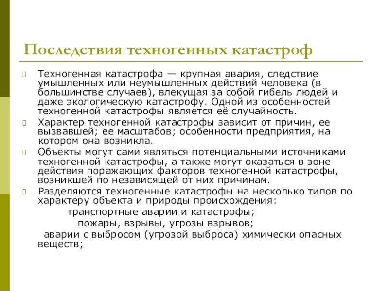 Характер техногенной катастрофы зависит от причин, ее вызвавшей; ее масштабов; особенности предприятия, на котором она возникла.