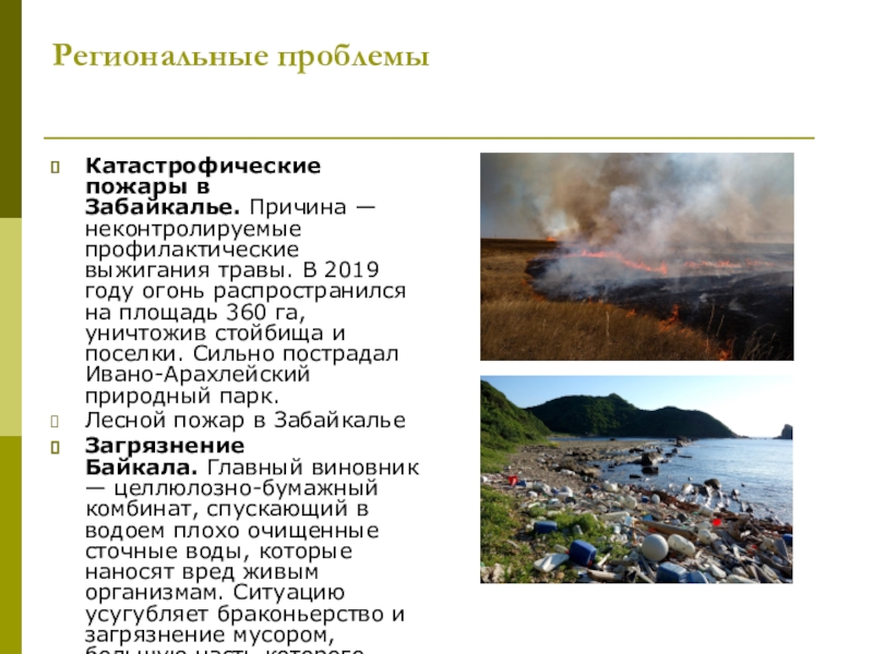 Загрязнение Байкала. Главный виновник — целлюлозно-бумажный комбинат, спускающий в водоем плохо очищенные сточные воды, которые наносят вред живым организмам. Ситуацию усугубляет браконьерство и загрязнение мусором, большую часть которого составляет пластик.