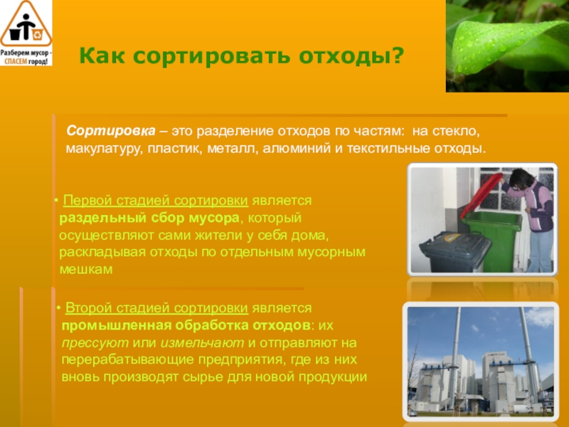 Второй стадией сортировки является промышленная обработка отходов: их прессуют или измельчают и отправляют на перерабатывающие предприятия, где из них вновь производят сырье для новой продукции