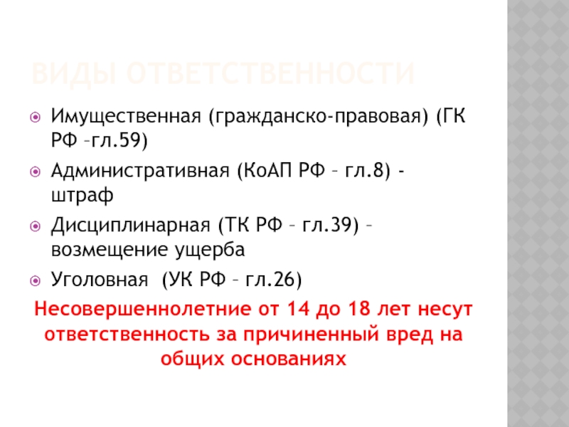 Несовершеннолетние от 14 до 18 лет несут ответственность за причиненный вред на общих основаниях