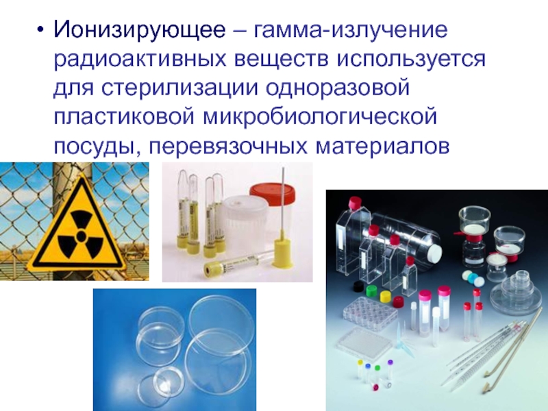 Слайд 12Ионизирующее – гамма-излучение радиоактивных веществ используется для стерилизации одноразовой пластиковой