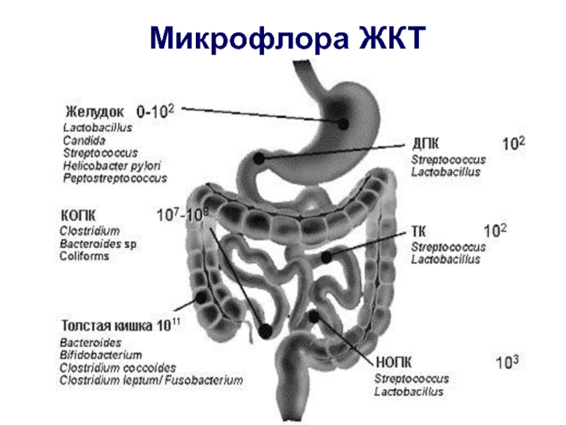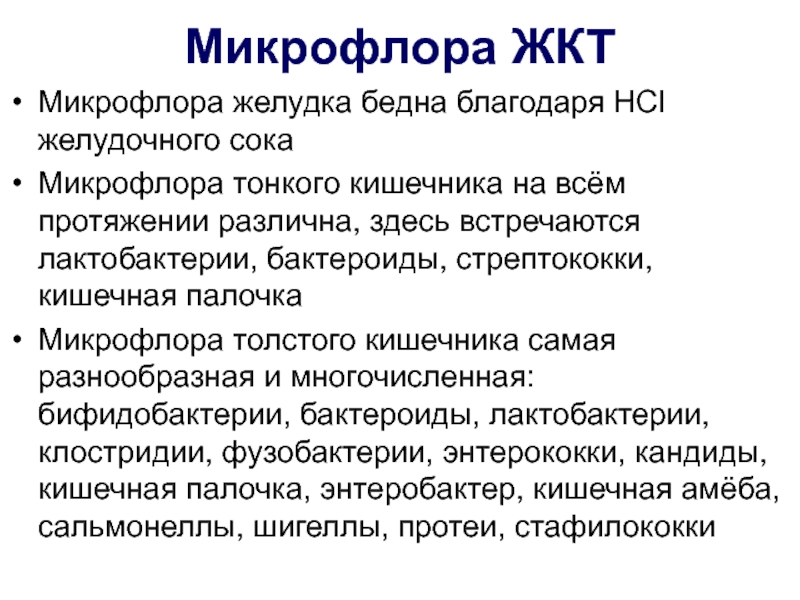 на всём протяжении различна, здесь встречаются лактобактерии, бактероиды, стрептококки, кишечная