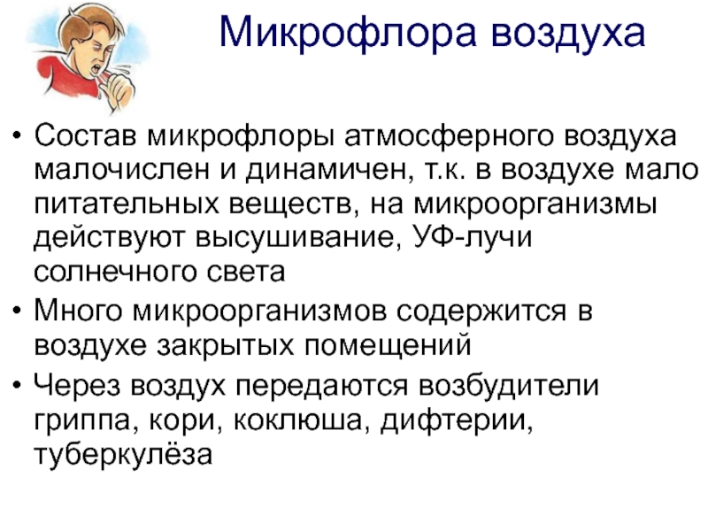 воздухе мало питательных веществ, на микроорганизмы действуют высушивание, УФ-лучи солнечного