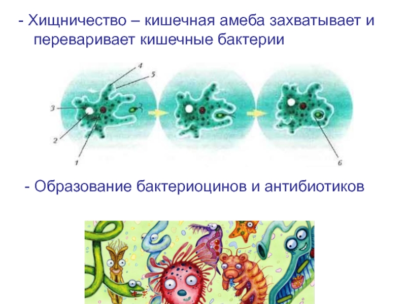 Слайд 19- Хищничество – кишечная амеба захватывает и переваривает кишечные бактерии