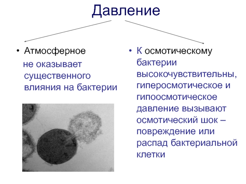 бактерии высокочувствительны, гиперосмотическое и гипоосмотическое давление вызывают осмотический шок –