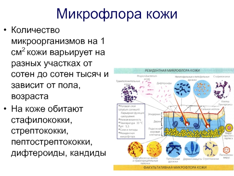 На коже обитают стафилококки, стрептококки, пептострептококки, дифтероиды, кандиды