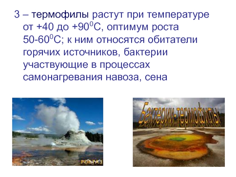оптимум роста 50-600С; к ним относятся обитатели горячих источников, бактерии