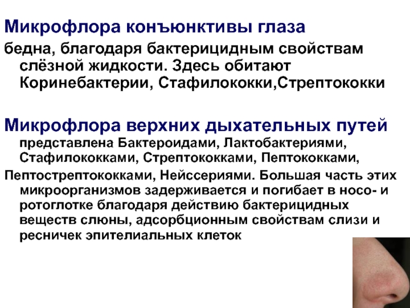 Пептострептококками, Нейссериями. Большая часть этих микроорганизмов задерживается и погибает в носо- и ротоглотке благодаря действию бактерицидных веществ слюны, адсорбционным свойствам слизи и ресничек эпителиальных клеток