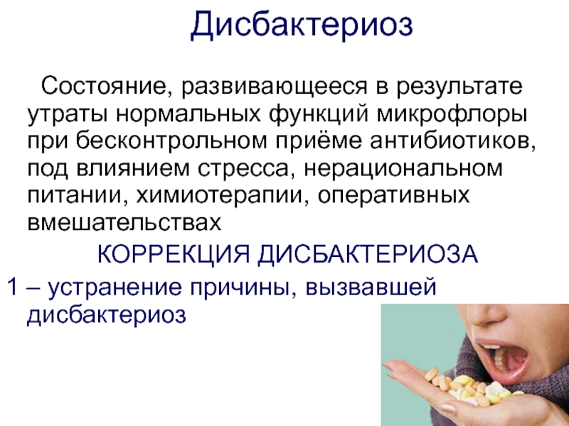 микрофлоры при бесконтрольном приёме антибиотиков, под влиянием стресса, нерациональном питании,