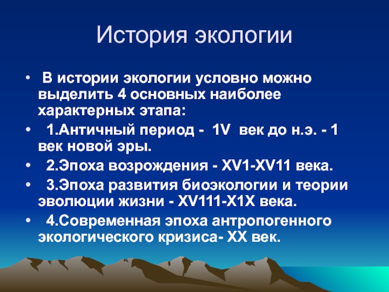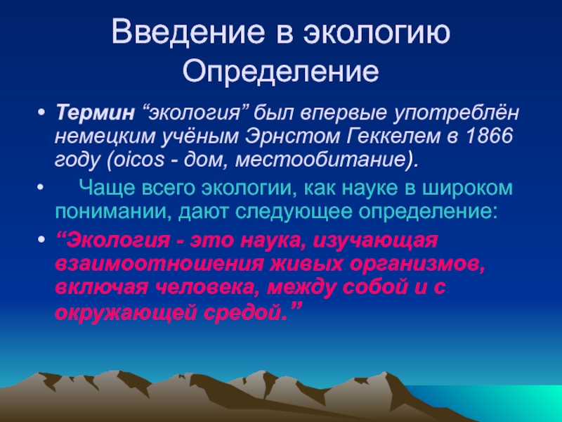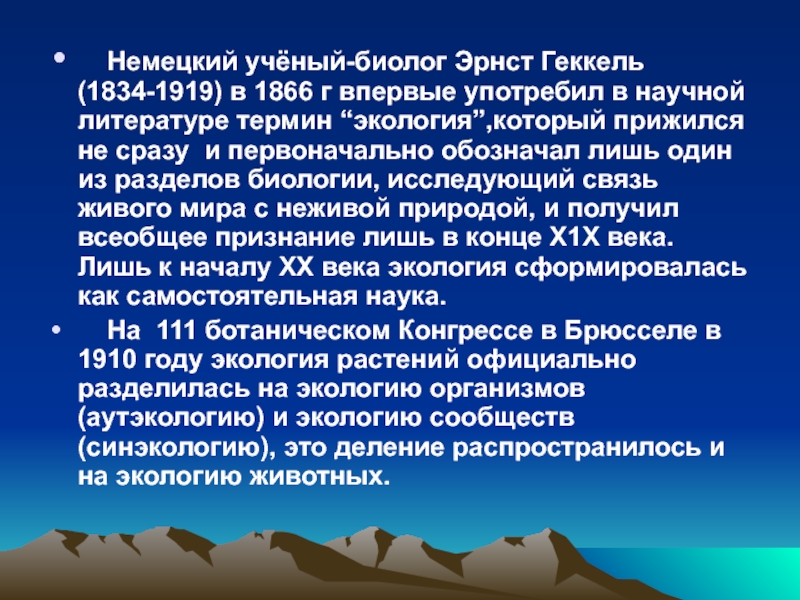 и первоначально обозначал лишь один из разделов биологии, исследующий связь живого мира с неживой природой, и получил всеобщее признание лишь в конце Х1Х века. Лишь к началу ХХ века экология сформировалась как самостоятельная наука.