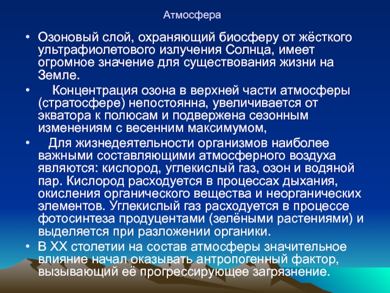 Озоновый слой, охраняющий биосферу от жёсткого ультрафиолетового излучения Солнца, имеет